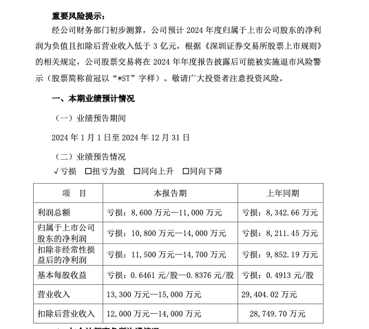 当天,高斯贝尔还发布了关于公司股票交易可能被实施退市风险警示的提示性公告。经公司财务部门初步测算,预计2024年度净利润为负值且扣除后营业收入低于3亿元。